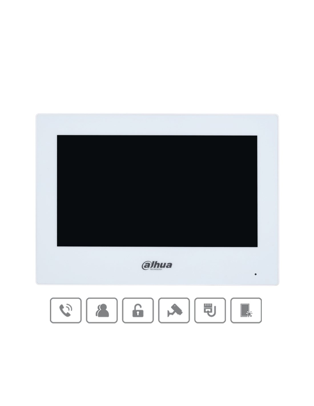 Dahua IP Indoor Monitor , 7″ TFT capacitive touch screen, 1024 × 600, 6-channel alarm input, and 1-channel alarm output, Standard PoE, Outdoor station and IPC monitor, H.265 and H.264 video coding, High performance & cost-effective.